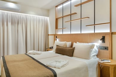 Our executive rooms consist of two separate rooms in order to serve any need for a comfortable stay. In the soothing tones of green and brown, with modern furniture and beautiful decorative artifacts, equipped with Smart TVs and smart spot lights, we assure you elegant comfort and the most enjoyable stay.
