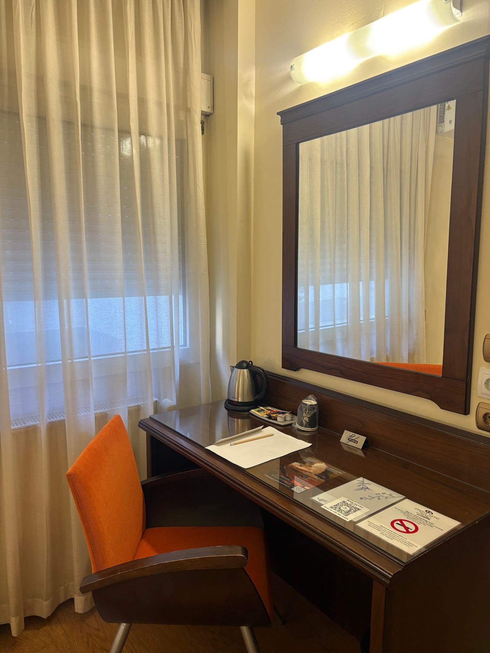 2 twin beds with anatomic mattresses, Work desk, Closet (with lowering shelves), Electronic locks, Individually Controlled Air Condition, Central heating, Soundproof Windows and shutters, Wi-Fi Internet Access (free of charge), Flat screen TV with satellite channels, Direct telephone line, Safe- deposit box, Room service, Kettle, Refrigerator, which upon request can be fully supplied with drinks and snacks (Mini bar), Full length mirror, Wheel chair accessible bathroom with shower and direct phone line, Bath Amenities, Slippers, Hairdryer, Daily Maid Service, Wake-up Call, Laundry, ironing and dry cleaning service.